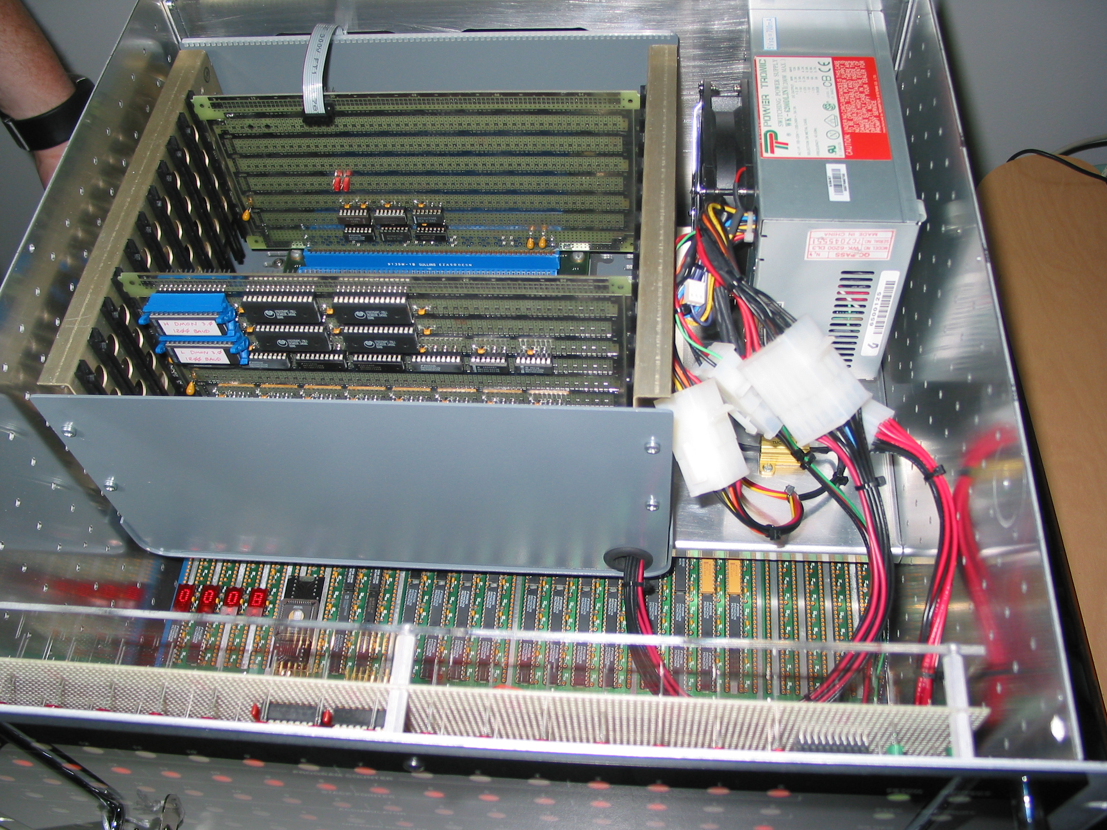Top view of D16/M internals Date: 07/09/2003 The innards of the D16/M (top view). Note the card cage (S100 mechanically but not electrically) and the PC-style switching power supply. A portion of the main CPU board is visible in the bottom of the chassis.