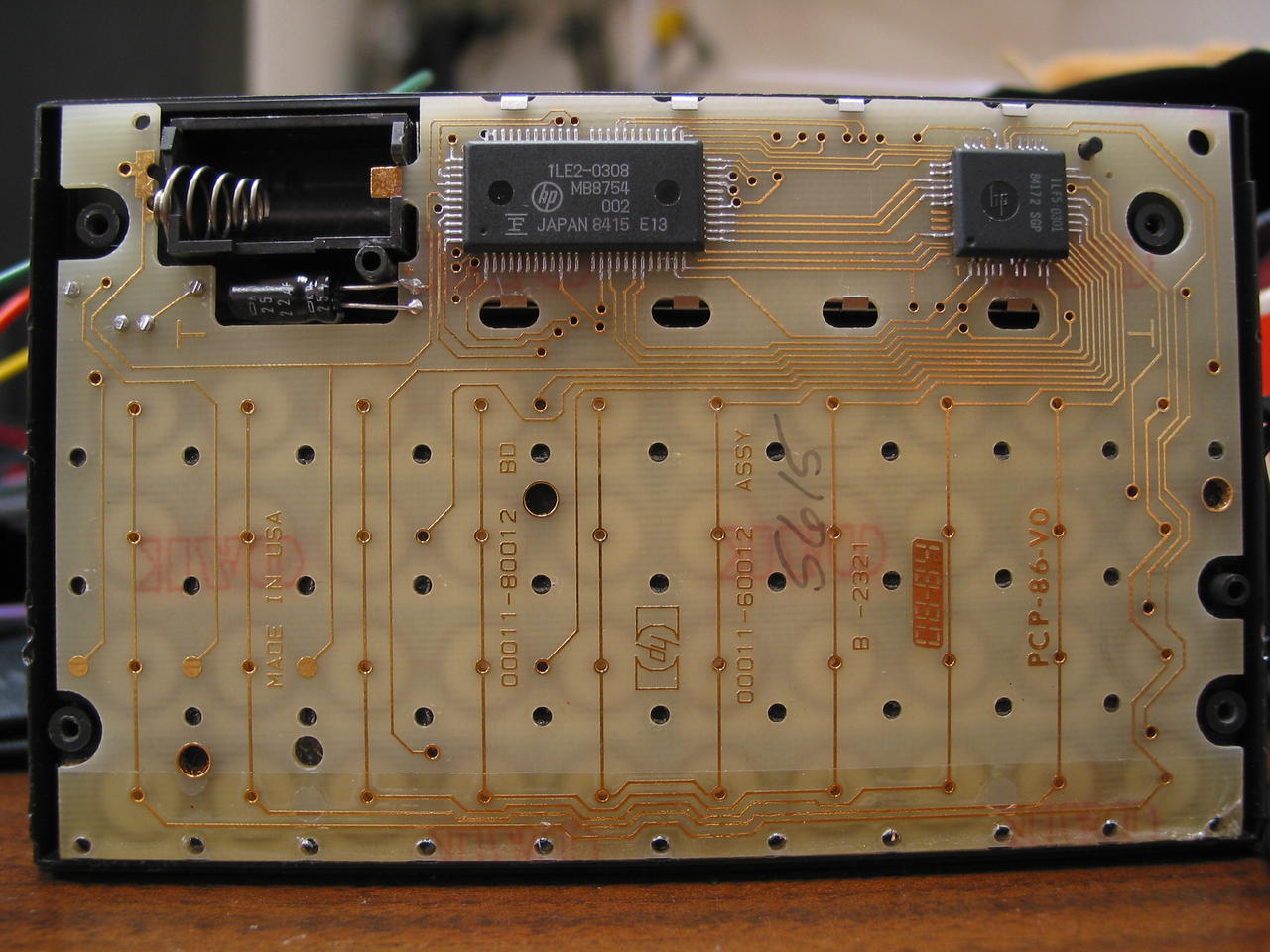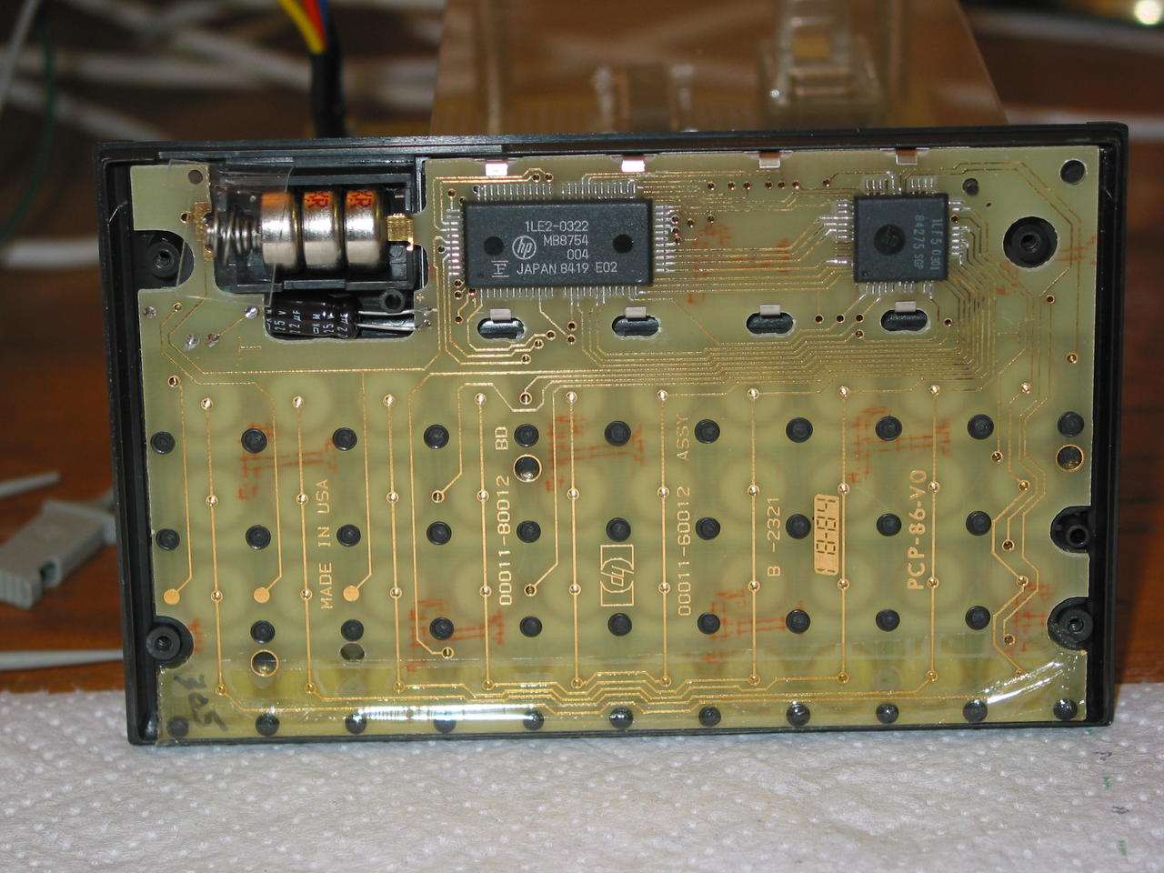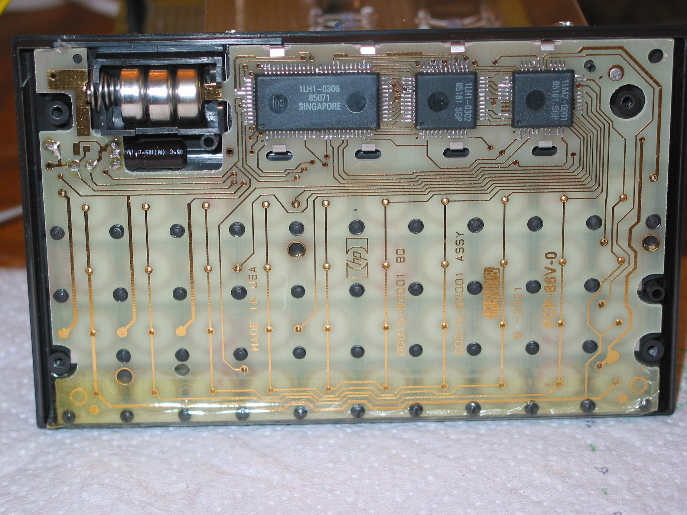 Top side of an HP-12C PCB, showing the snap-discs for the keyboard. This unit has a broken LCD display.