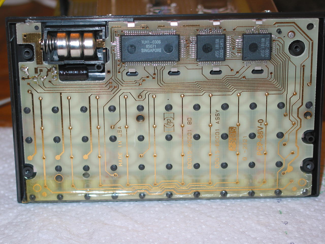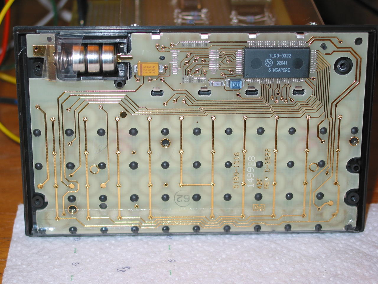 Top of HP-12C PCB showing snap-discs for keyboard