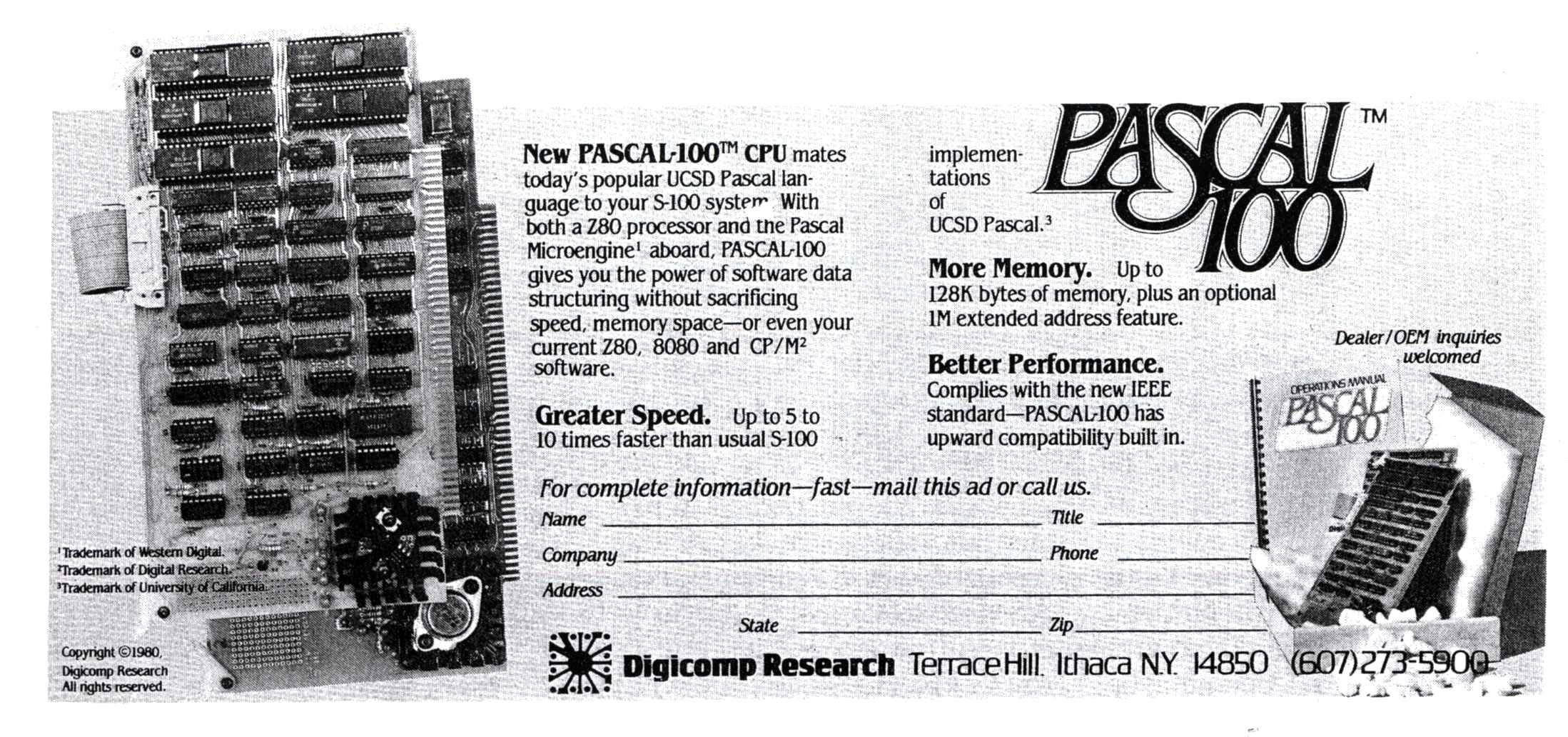 Advertisement for the Digicomp PASCAL-100, a two-board CPU for the S-100 bus based on the WD/9000 Microengine chipset.