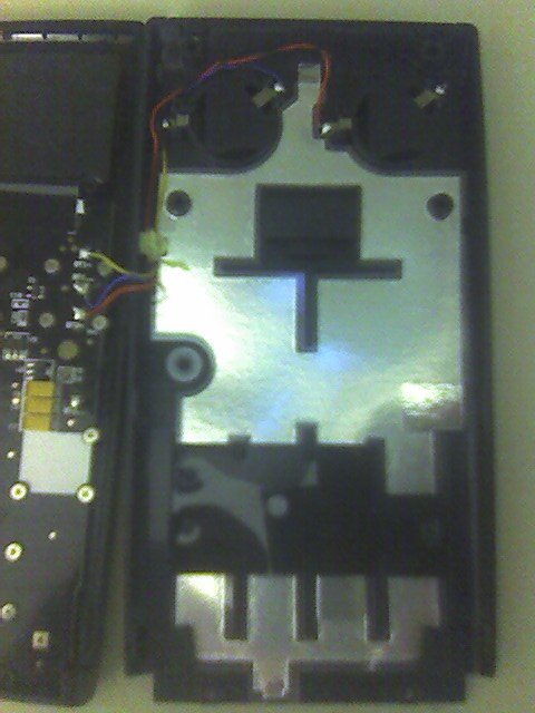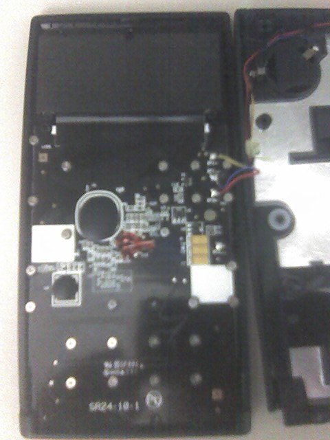 Top half of case, with main PCB. The GeneralPlus microcontroller and the static RAM chip are mounted using Chip-On-Board techno